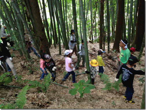 その後、1年以上この竹やぶに入っていますが、私でもまだ入ったことのない未開の竹やぶを登り始め、平らなところだけで作業するつもりだったので、「おっ、おっ、大丈夫か...?」と不安に思いましたが、子供もやはりそんな弱くはないというか、森の幼稚園をやっている方が言っていましたが、危険な場所では危険を自分で察知できて、逆に何の障害もないような場所だと油断して怪我をするようなことを言っていました。